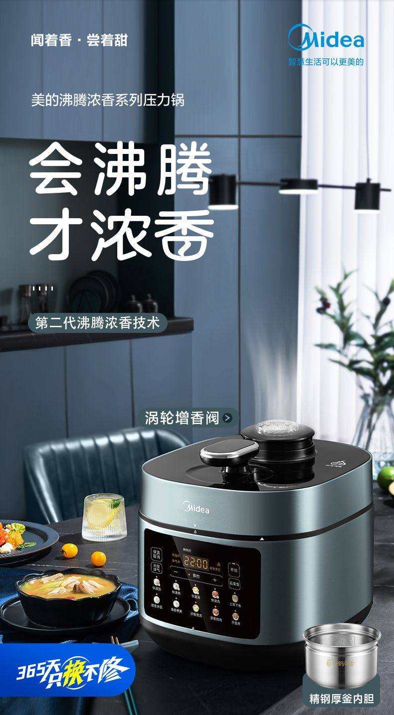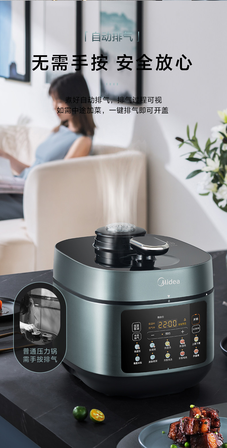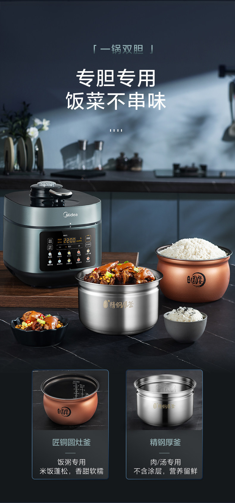 美的电压力锅家用5L大容量0涂层不锈钢双胆多功能智能饭煲高压锅
