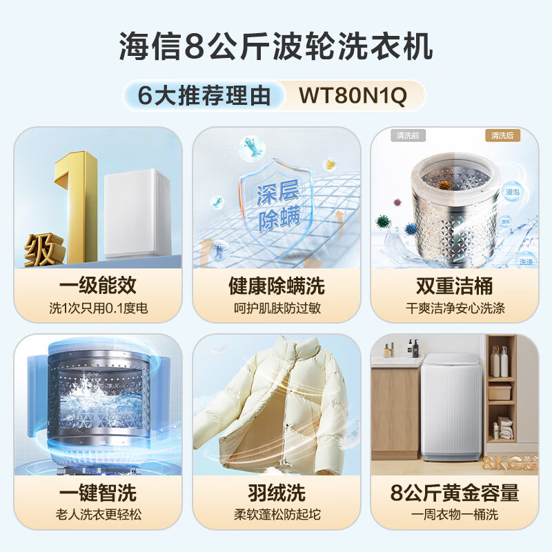 海信(Hisense)波轮洗衣机全自动 8公斤大容量波轮健康家用租房宿舍一级能效WT80N1Q以旧换新家电补贴20%